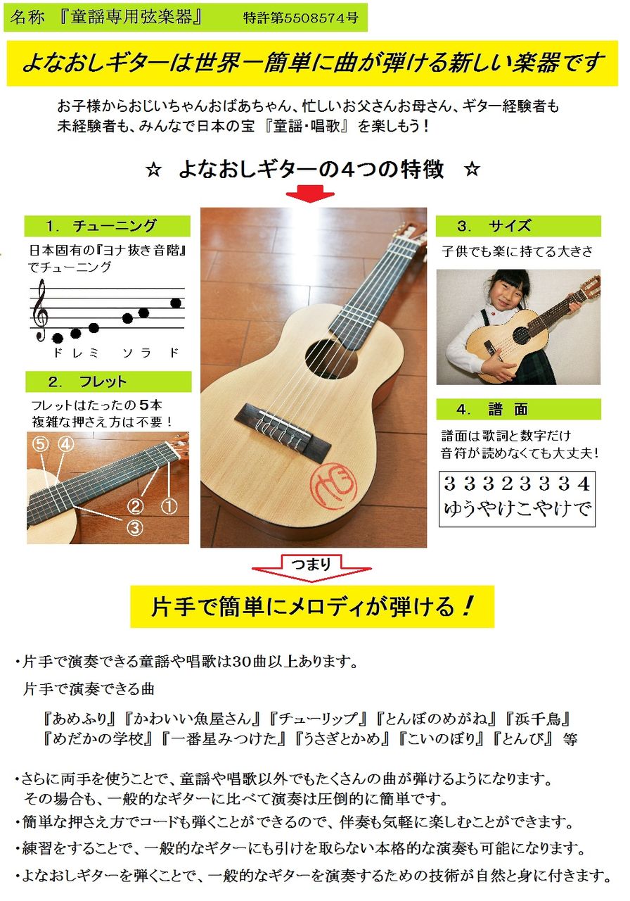 よなおしギターは、先ほど弾いて頂きましたように、片手それも利き手だけで曲が演奏できるんです。