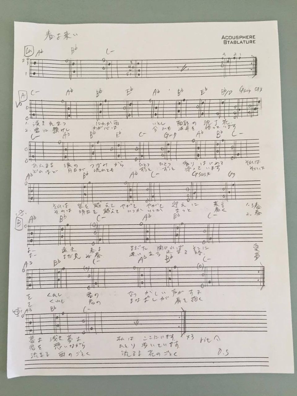 彼女直筆のコード譜を載せます。アレンジの過程が生々しく伝わってきますね。