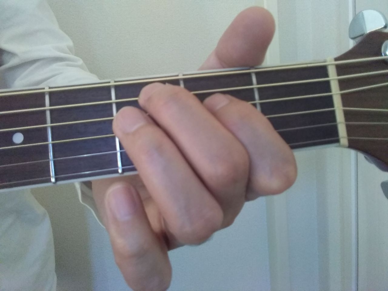 次にギターを持って、マーキングした場所を実際に左手で(左利きの場合は右手で)押さえてみましょう。