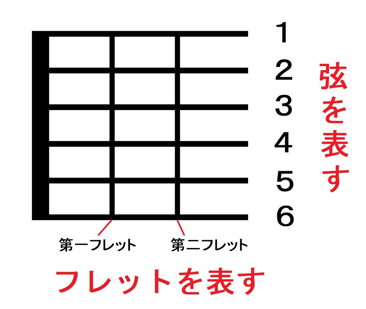 まず前提として、コードを表す図では『縦の線がフレット、横の線が弦』を表します。また、図では『下が6弦、上が1弦』となりまので、実際にギターを持った時とは上下が逆になります。