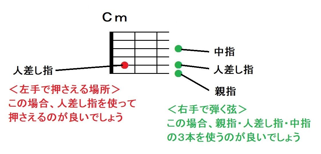 そして、『赤丸は左手で押さえる場所、緑の丸は右手で弾く弦』を表します。例えば、<Cm>というコードは以下のように左右の手を使うことで演奏できます。