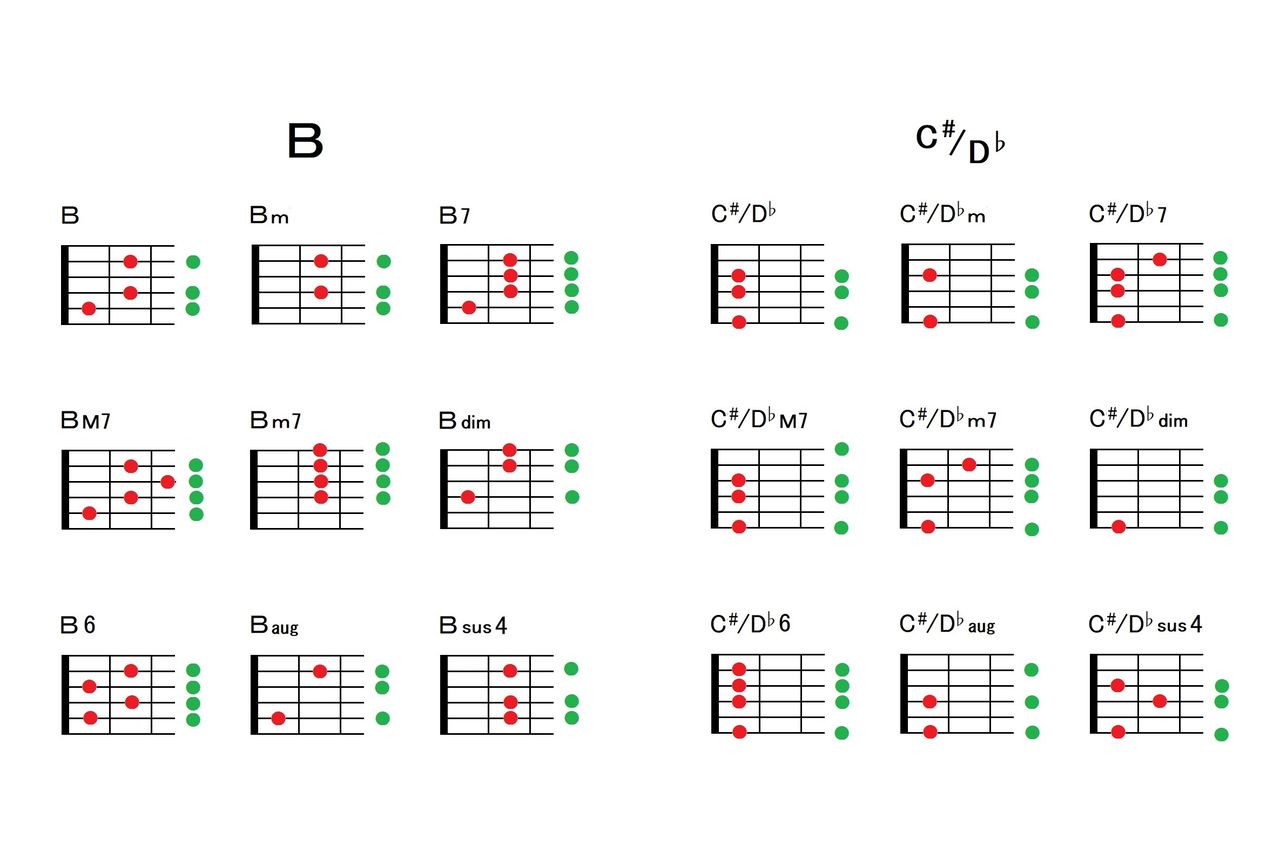 コードは非常に多くの形が存在しますので108個ではそれら全てを網羅したとは言えませんが、童謡、フォーク、ロック、ポップス、演歌の弾き語りはこのコード表でほぼカバーできるでしょう。