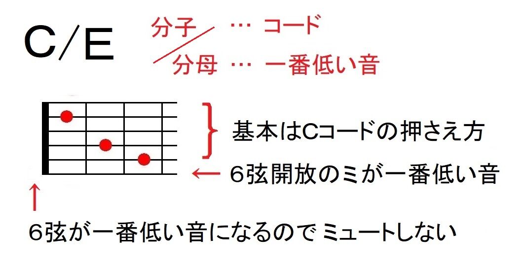 つまり分数コードでは『分子がコード』を表し『分母が一番低い音(ベース音)』を表します。<C/E>の実施の押さえ方は以下のようになります。