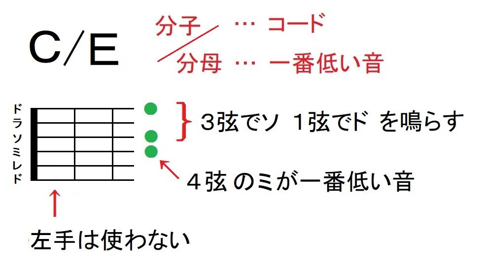 <C>というコードは低い方から順に『ド・ミ・ソ』と鳴らしますが、<C/E>は低い方から順に『ミ・ソ・ド』と鳴らします。