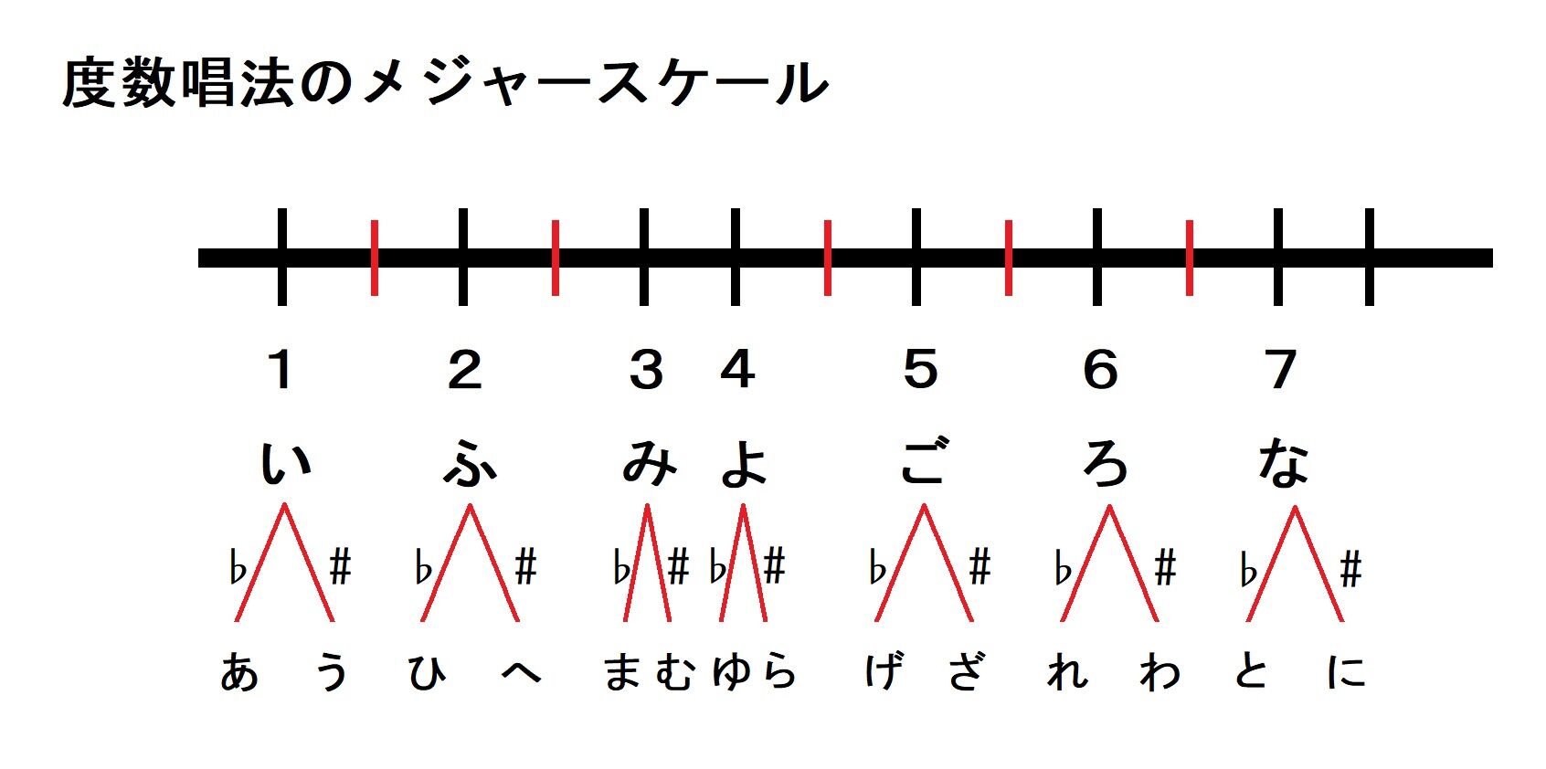 これは非常に重要な考え方なので、当然度数唱法でもその区別ができるように、基本のメジャースケール『い・ふ・み・よ・ご・ろ・な』の全ての音にそれぞれ#と♭が付いた場合の音を割り当てました。