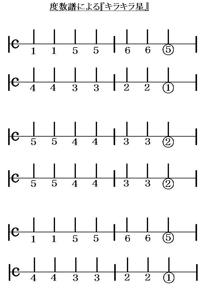 度数譜とは、簡単にいうと度数で書かれた楽譜です。例えば『キラキラ星』を度数譜にするとこんな感じです⇓
