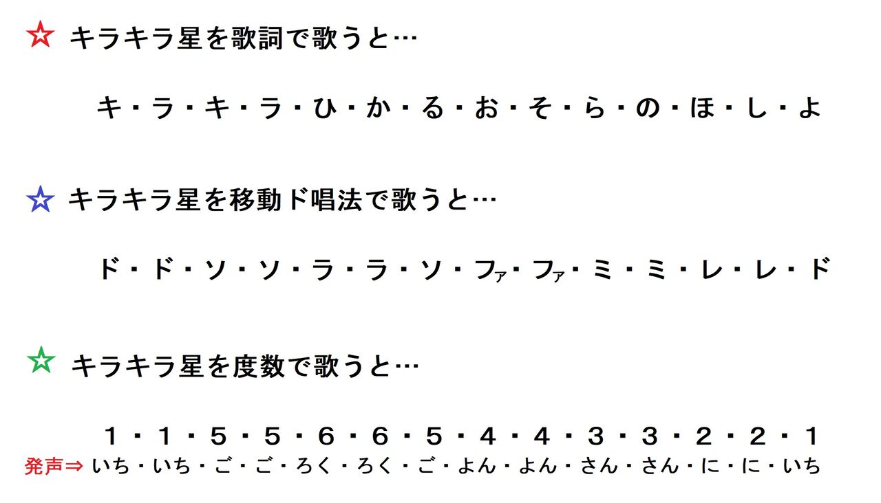 度数を歌うと考えた時に一番ネックになるのが言葉の音数です。例えば、『キラキラ星』を歌詞・移動ド唱法・度数の3つの方法で歌った場合、以下のようになります。
