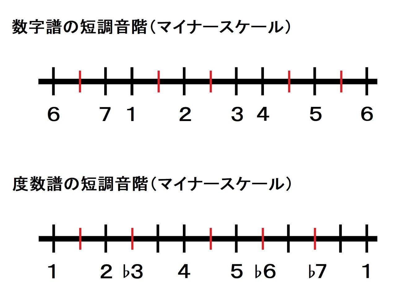 ご覧のように、数字譜でのマイナースケールは『6』から始まるのに対し、度数譜では『1』から始まります。